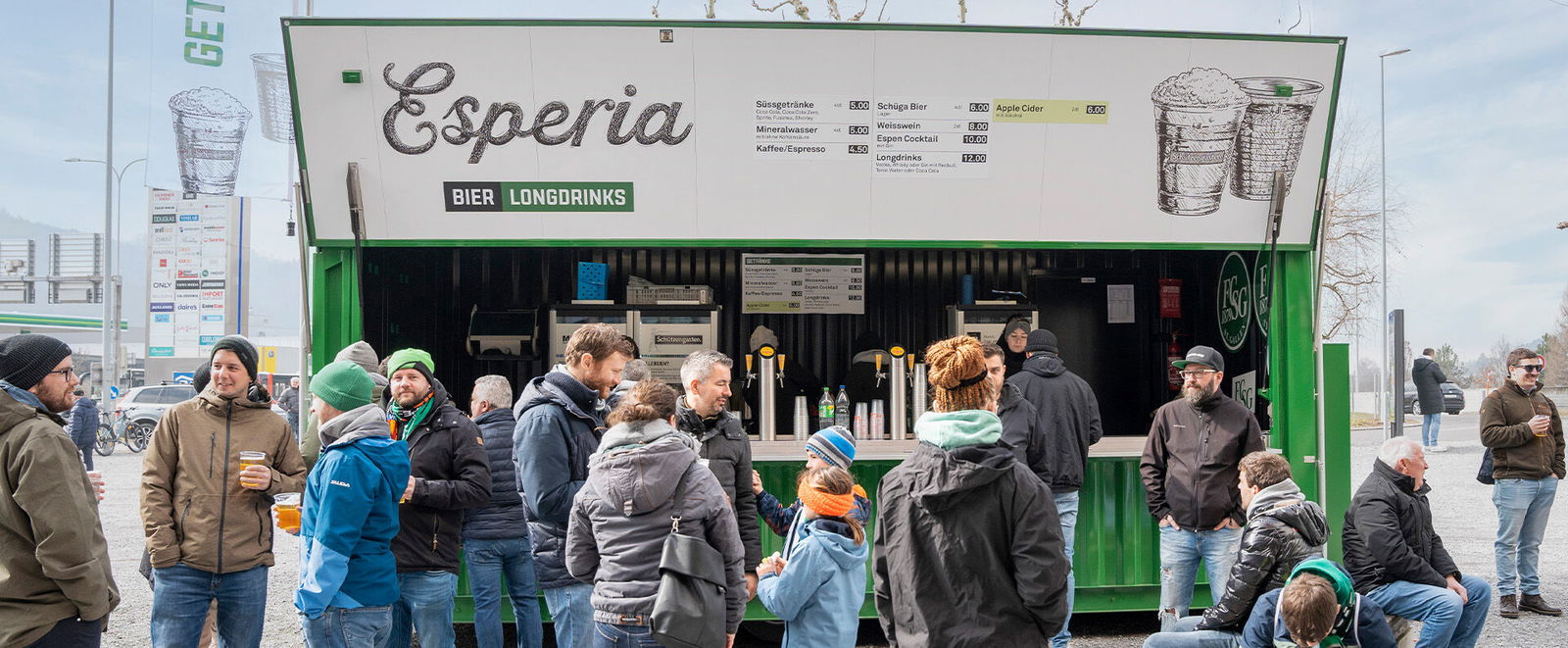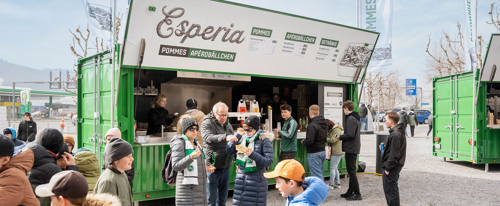 Überraschen Sie Ihre Gäste! Haben Sie einen Firmenanlass, ein Mitarbeiter- oder Familienfest, oder sonst einen Event, der eine besondere Kulisse benötigt? Dann holen Sie den FC St. Gallen 1879 zu sich – wir sind mobil! Verpflegen Sie Ihre Gäste mit einem «Esperia»-Contrailer. Je nach Event, Ihren Bedürfnissen und der Anzahl Gäste sind wir mit einem oder mehreren Contrailern vor Ort. Übrigens sind Contrailer eine Kombination aus Seecontainer und einem Food-Truck. Wenn Sie für Ihre Firma oder Privatfeier ein Essen oder einen Event planen, teilen Sie uns Ihre Vorstellungen mit. Denn jeder Event ist einzigartig. Gemeinsam mit Ihnen finden wir die perfekte Lösung. Wir machen Ihnen gerne ein auf Ihre Bedürfnisse abgestimmtes Angebot. Mieten Sie unsere Contrailer, machen Sie ihren Event zu einem unvergesslichen Erlebnis – mit einem Hauch Stadionatmosphäre.