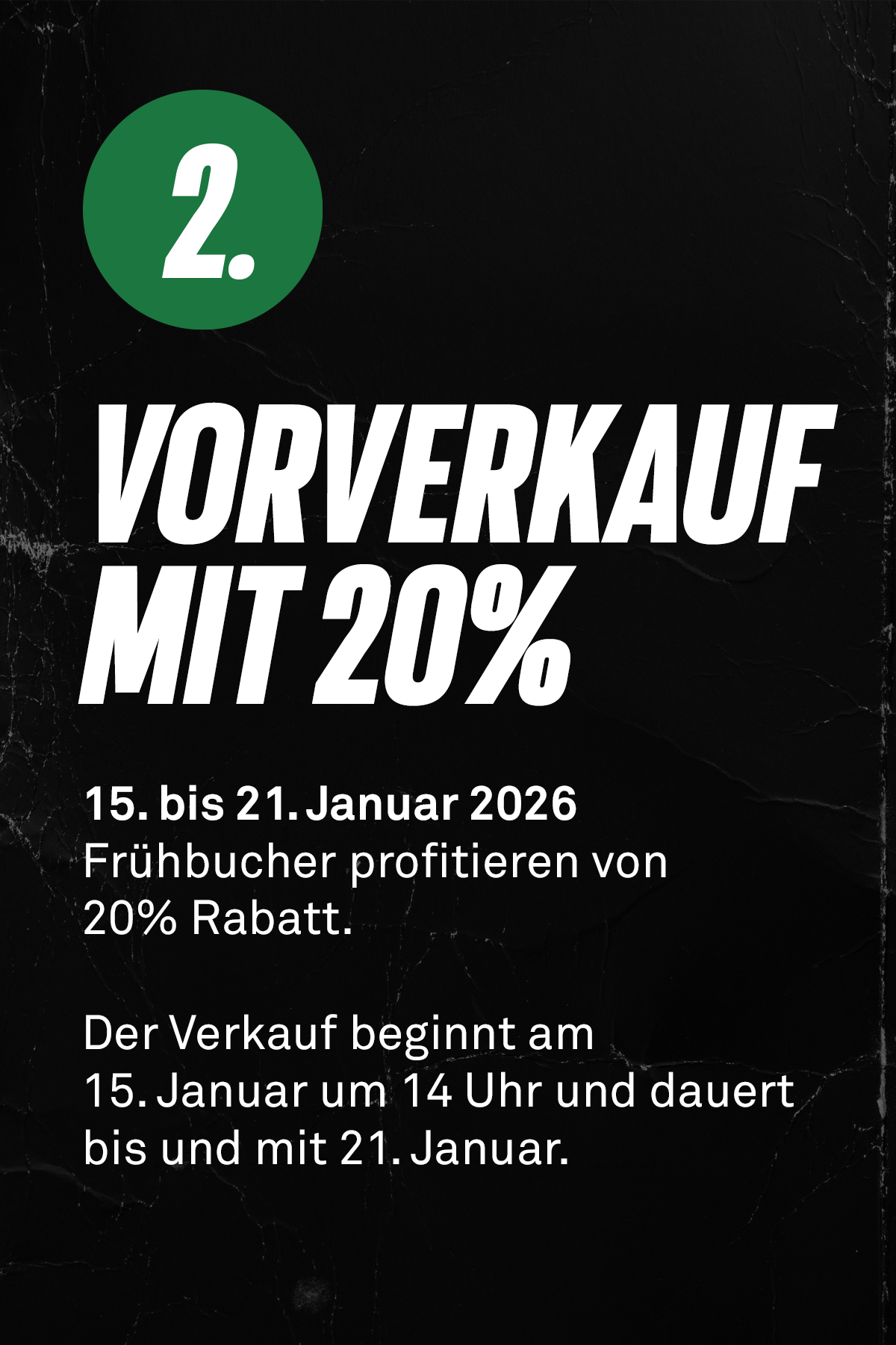 Der Vorverkauf für Partner mit Saisonabo läuft bis Freitagmittag, 23. Januar 2026. Als Partner mit Saisonabo profitierst du von 20% Rabatt und einem Vorkaufsrecht auf deinen Platz.