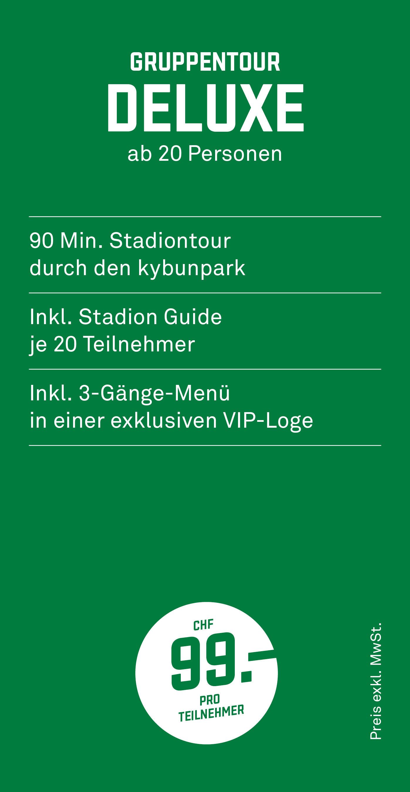 Unsere Stadiontour führt Sie von den VIP-Logen über die Zuschauerränge bis hinunter zum heiligen Rasen. Während 90 Minuten zeigt Ihnen ein Guide die Bühne unseres FC St.Gallen 1879 mit allem, was dazu gehört. Wie spannende Geschichten und lustige Anekdoten. Ein eindrückliches Erlebnis für Sie und Ihre Kunden, Kollegen oder Freunde.