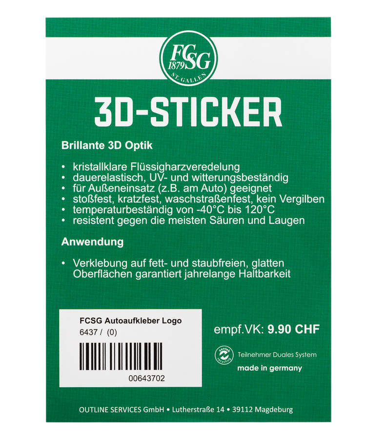 Hochwertiger 3D-Sticker mit FCSG-Logo für dein Auto. Dauerelastisch, UV- und witterungsbeständig, kratz- und stossfest - bleibt auch in der Waschstrasse am Wagen.