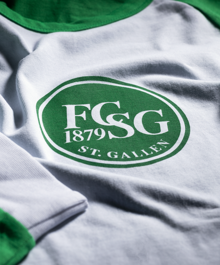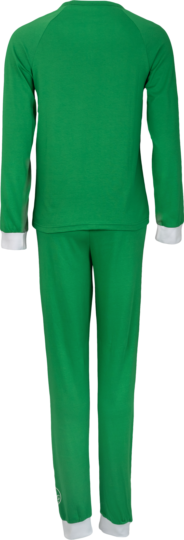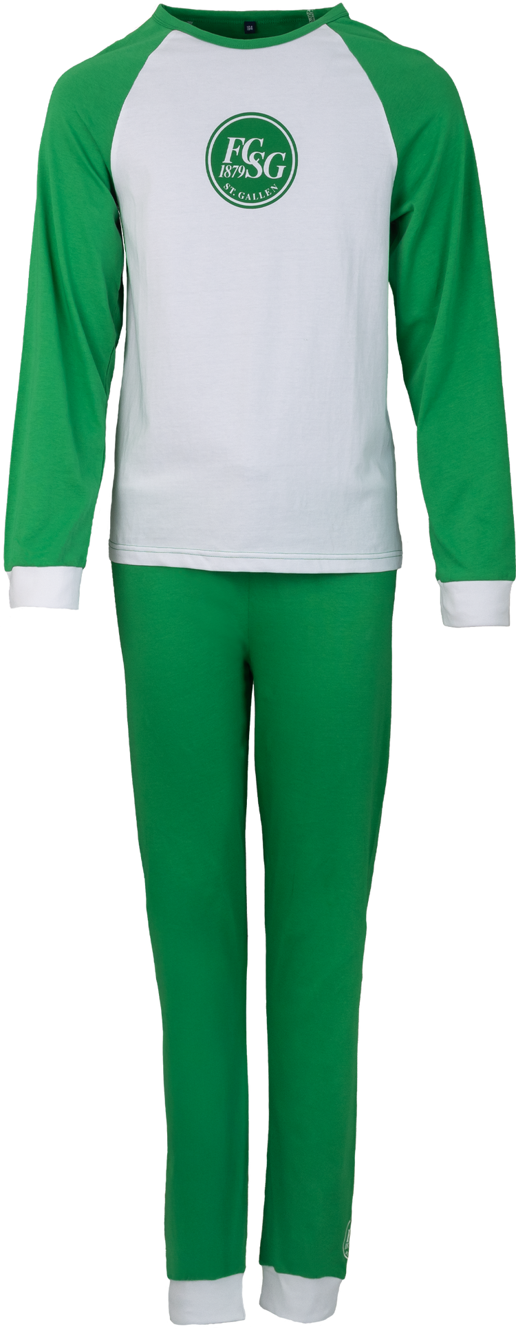 Schlafen auf grünweissen Wolken. Der Kinderpyjama aus reiner Baumwolle - da sind glückliche Träume vom nächsten Titel praktisch garantiert.