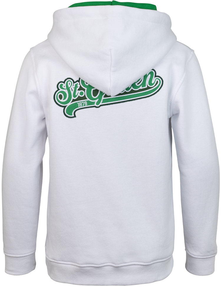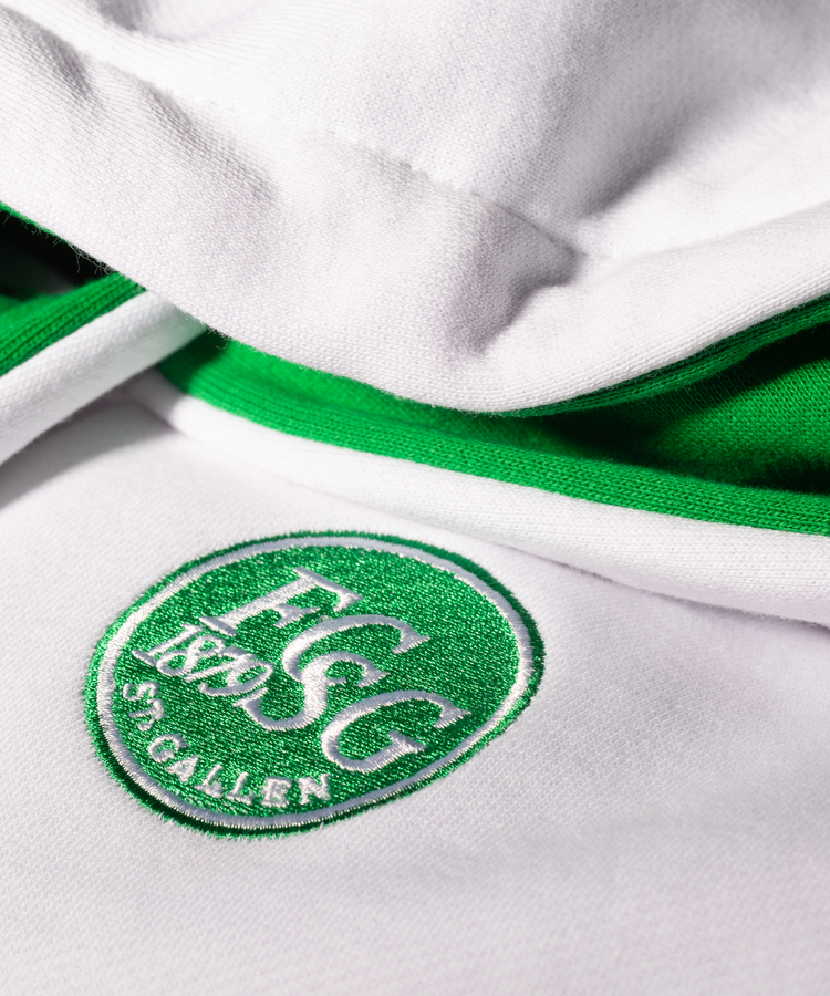 Weisser oversized Hoodie aus Baumwolle mit dem Clublogo auf der Brust und dem Stad-Schriftzug in aufwändiger 3D-Stickerei als Rückenprint. Die Stadt im Rücken!