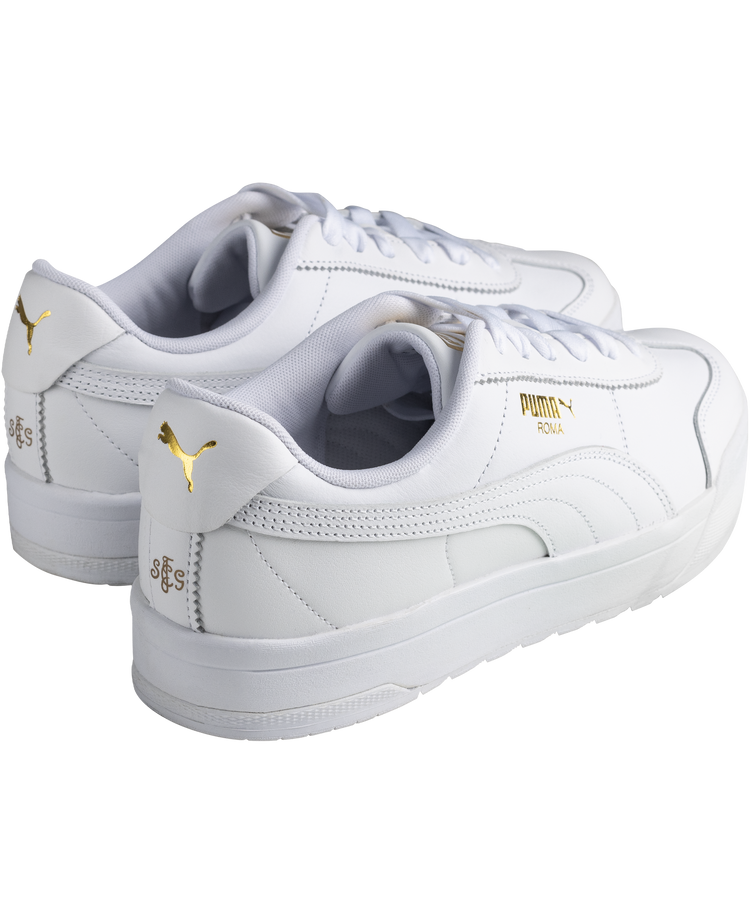 Endlich ein FCSG x PUMA-Sneaker für Frauen. Der weisse "Roma" ist ein edles Ledermodell mit sportlicher Form und goldenen Logo-Prints auf der Ferse. Grünweisser Lifestyle für Alltag, Büro und Stadion!