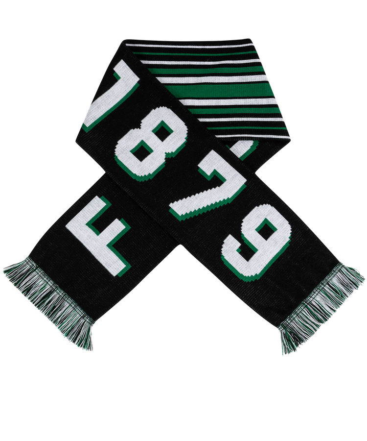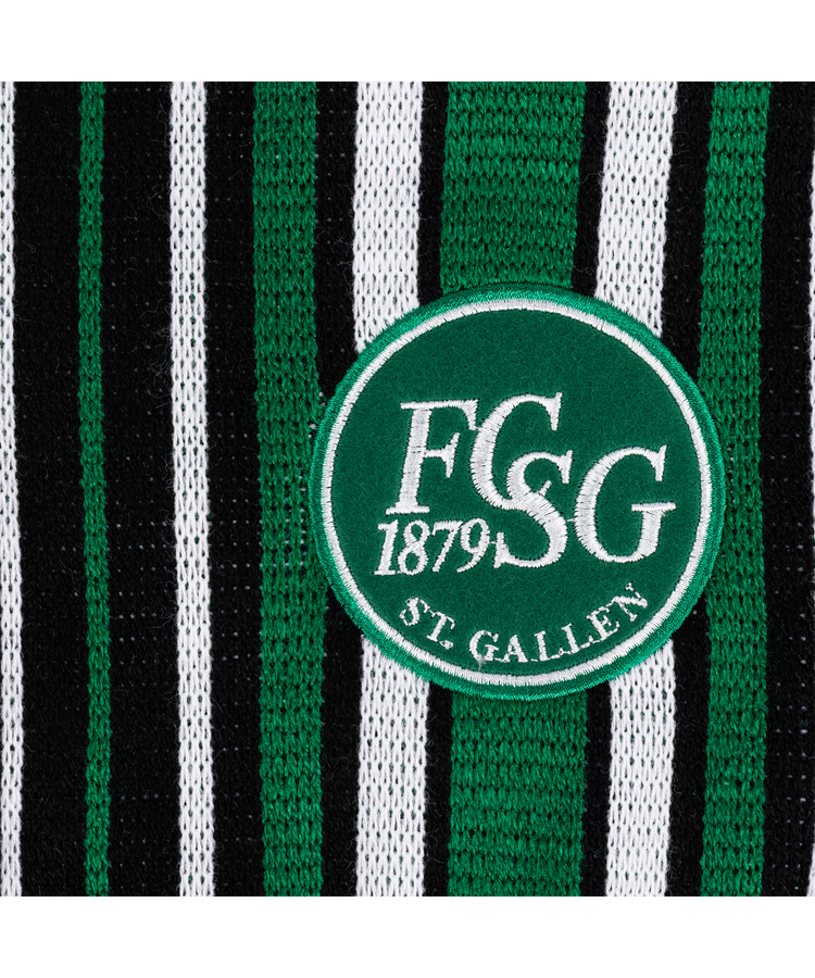 Schöner Wollschal mit grünen, weissen und schwarzen Streifen und grossflächigem Logo auf der Rückseite. Zeig deine grünweisse Liebe!