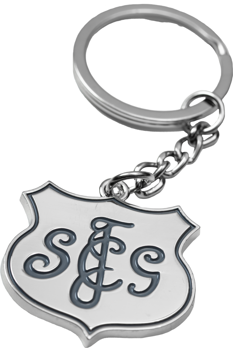Silberner Schlüsselanhänger aus Metall mit silbernem Retro-Logo.
