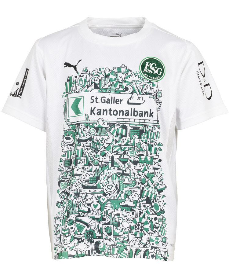 Das FCSG-Sondertrikot 24/25 wurde in Zusammenarbeit mit dem bekannten St.Galler Streetart-Künstler Drüegg entworfen. Er hat das, was den FCSG aus seiner Sicht ausmacht, in eines seiner Wimmel-Gemälde einfliessen lassen. Auch nach längerer Betrachtung fallen einem immer neue kleine Details auf. Findest du zum Beispiel das Logo aus den 60er Jahren, Gallus oder das Sitterviadukt?