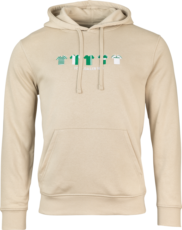 Legendäre St.Galler Trikots, eine kleine Auswahl - wer erkennt sie? Die Designs sind hochwertig verarbeitet und auf den Hoodie aus Bio-Baumwolle und recyceltem Polyester gestickt.