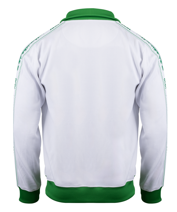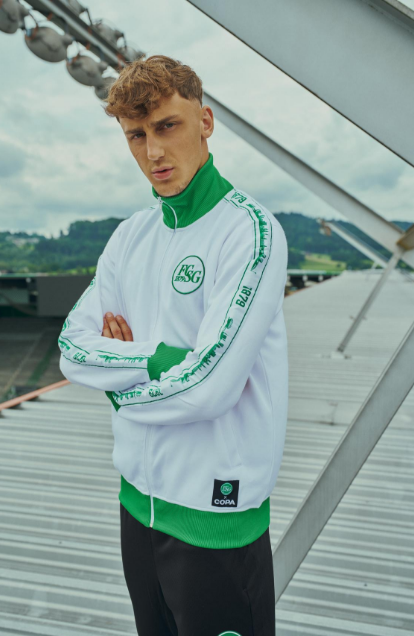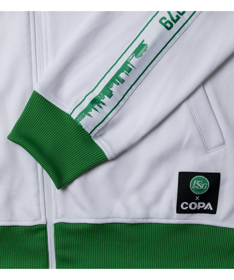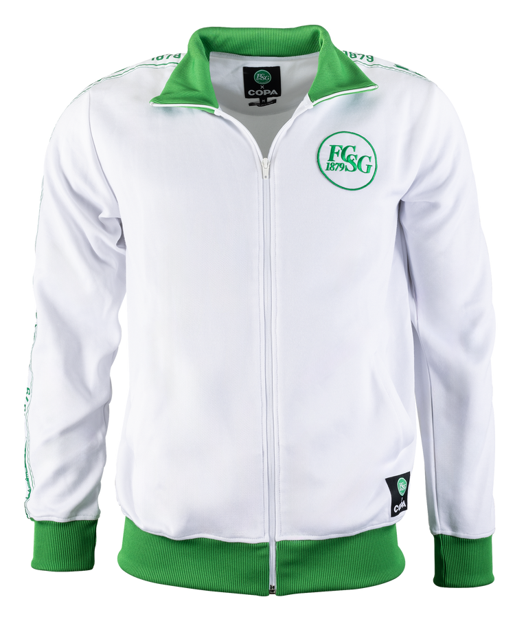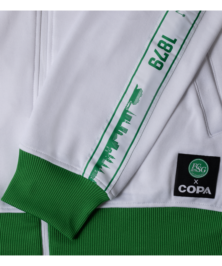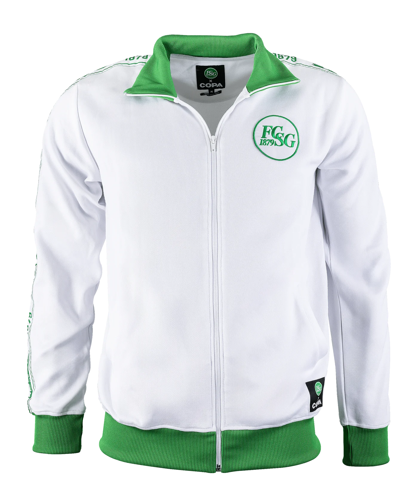 Retrocharme in weiss und grün! Diese Trainingsjacke ist der FCSG-Trainingswear aus den frühen 80ern nachempfunden und besticht durch eine sehr hochwertige Produktion des niederländischen Labels COPA.